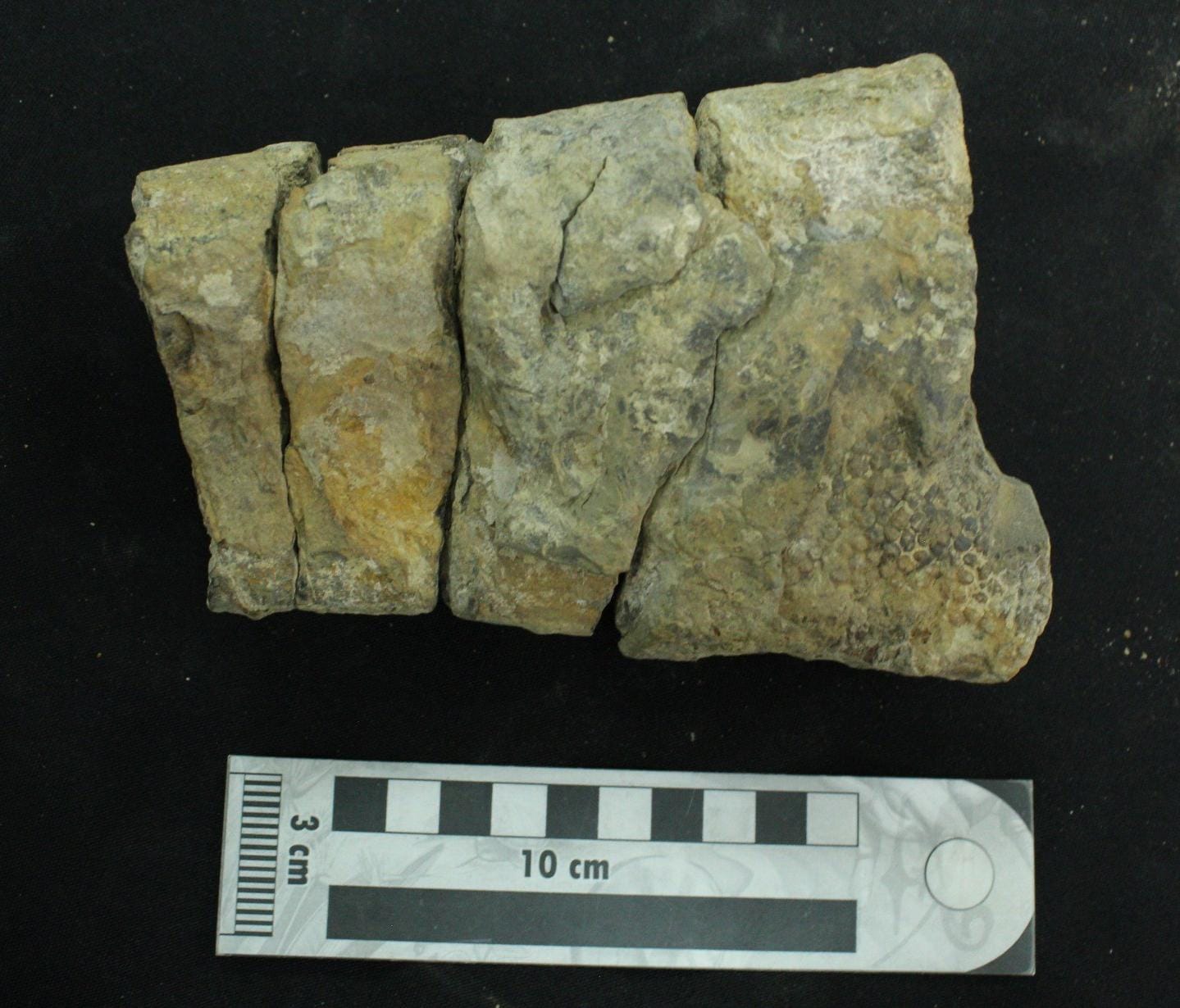 Como parte del proceso de revisión, se analizaron las impresiones de piel en el material donado por Rojas, algunas se hallaban aisladas y otras adheridas a los huesos. Las muestras se observaron en los dos ejemplares, en el pequeño (juvenil) se encontraba en la ulna (también conocida como cúbito o antebrazo) derecha, mientras que, en el grande (adulto), en tres huesos del lado izquierdo: la escápula, ulna (Fig. 4) y tibia. La observación e identificación de la piel fue muy compleja, ya que en algunas ocasiones las muestras no eran visibles, por lo que las piezas se tuvieron que manipular para que la luz incidiera desde distintos ángulos y poder así detectar la impresión de piel. Asimismo, durante el proceso de limpieza se recolectaron más muestras, las cuales estaban cubiertas por sedimento que corresponde a lutita.