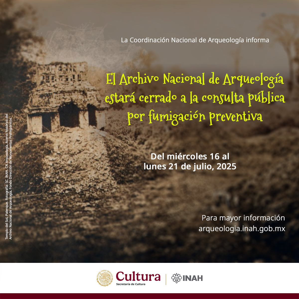 La Coordinación Nacional de Arqueología informa que el Archivo Nacional de Arqueología estará cerrado a la consulta pública por fumigación preventiva, del miércoles 16 al lunes 21 de julio, 2025.