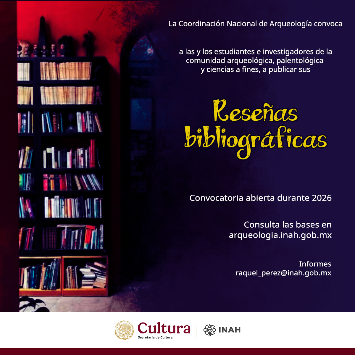 El Instituto Nacional de Antropología e Historia, a través de la Coordinación Nacional de Arqueología, invita a las y los estudiantes e investigadores a publicar sus reseñas bibliográficas de libros científicos y de divulgación arqueológica y paleontológica, en la sección Reseñas bibliográficas de nuestra página web oficial.